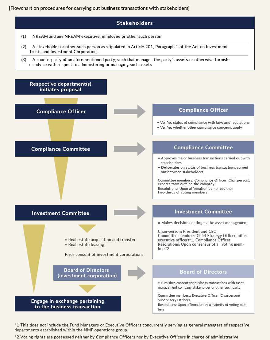 - The Asset Management Company, under the basic recognition that the management operations of NMF’s assets comprise the management of the capital of NMF’s unitholders, believes that confirming the status of compliance with laws, and sufficiently securing the elimination, etc., of conflicts of interest in transactions with stakeholders, etc., as stipulated in the Act on Investment Trusts and Investment Corporations, and with transactions, etc., where stakeholders, etc., manage the assets or offer advice relating to management or operations, is particularly important in protecting unitholder’s profits and securing the trust of unitholders. From this perspective, the Asset Management Company has established the following structure regarding compliance, and has made sufficient considerations to ensure that this gets consistently implemented.