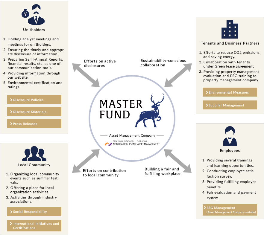 Having identified unitholders, tenants, business partners and employees as well as residents of neighboring communities as our key stakeholders, we will strive to win their trust by maintaining constructive dialogue and sincerely addressing their expectations and requests. In these ways, we will improve NMF’s operations and ESG-related initiatives.