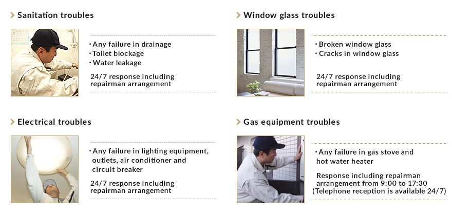 We offer “ Chintai Hotto Support” exclusively for residents and telephone reception is available for responding to any equipment troubles 24/7, 365 days a year