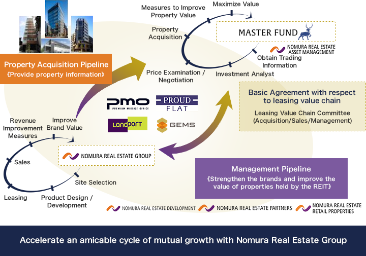 In an aim to increase unitholder value, NMF will establish a positive cycle of mutual growth with the Nomura Real Estate Group through the establishment of a management pipeline with a two-way function in which external growth support through a property acquisition pipeline where the Nomura Real Estate Group supplies information on real estate, etc. as well as the measures necessary for the increase of the brand value of portfolio properties and the value of assets are jointly deliberated and promoted.