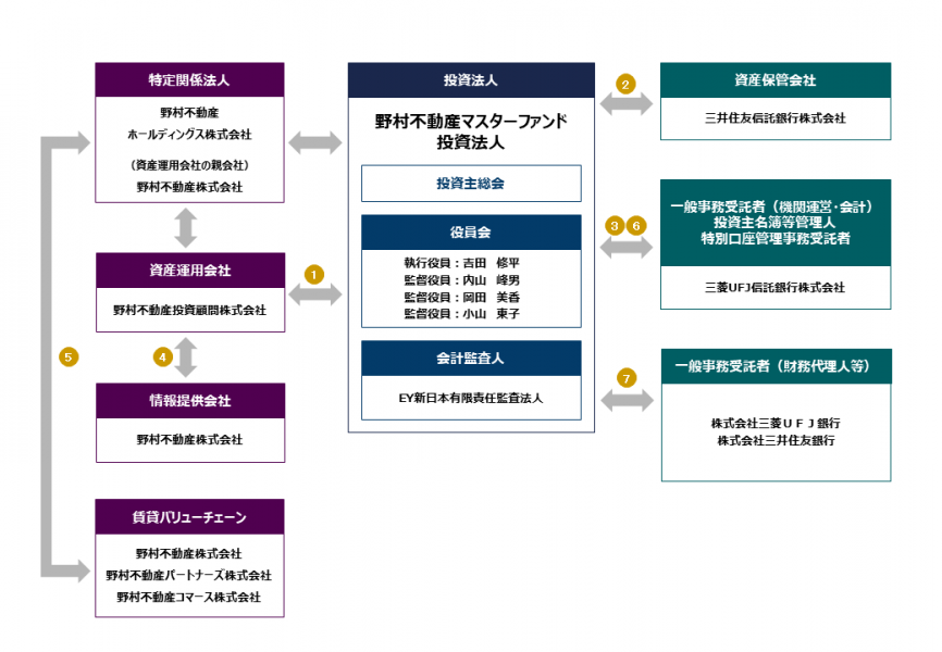| 野村不動産投資顧問株式会社 | 資産運用会社 | 資産運用委託契約に従い、本投資法人からの委託に基づき、資産運用会社として、本投資法人の規約並びに同規約に定める資産運用の対象及び方針に従い、本投資法人の資産の運用を行います。 |