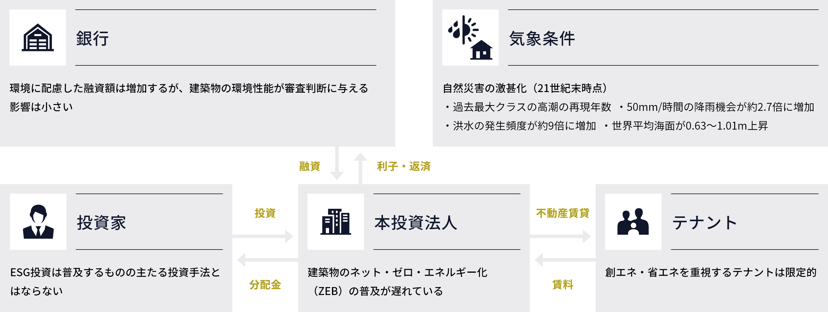 気候変動は、中長期なリスクを有しており、これに適切に対処できない場合には、運用資産の着実な成長を望めなくなり、中長期的な投資主価値の向上を図ることが困難になるおそれがあります。