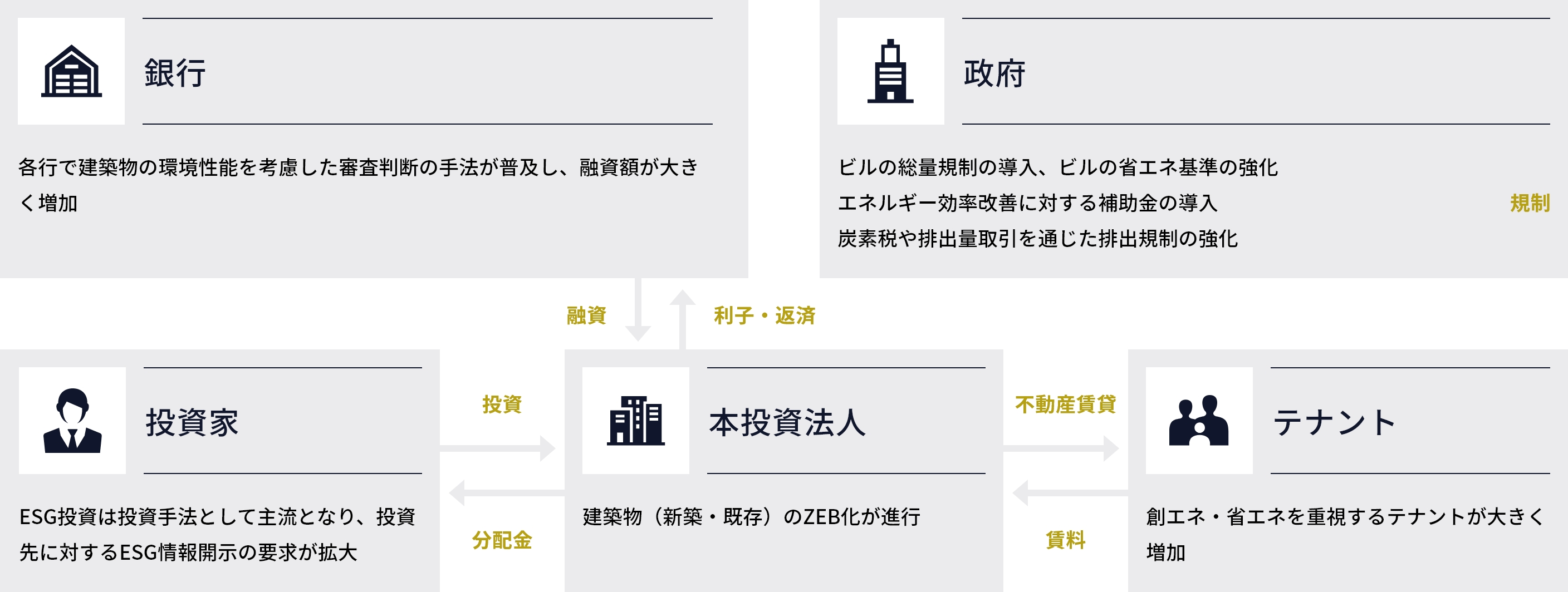 | 市場 | カーボンニュートラルを目指す企業の増加 入居者による創エネ・省エネ性能重視の物件選び |