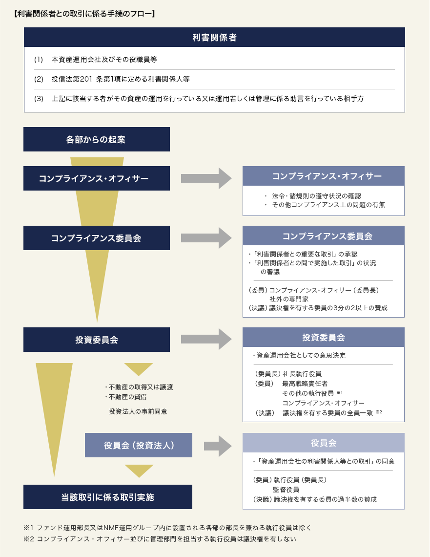 投資委員会に提出される議案は、コンプライアンス・オフィサーにより、法令・諸規則への違反、抵触その他コンプライアンス上の問題の有無を判断することとなっています。当該判断において、本資産運用会社の社内規程である利害関係者取引規程に定める「利害関係人との重要な取引」に該当すると判断された場合、その他その内容に鑑み必要と認めた場合には、コンプライアンス委員会を招集し、更に法令・諸規則の遵守状況その他コンプライアンス上の問題の有無について審議することとなっており、その承認を得た後でなければ、投資委員会において当該議案を提案することはできません。