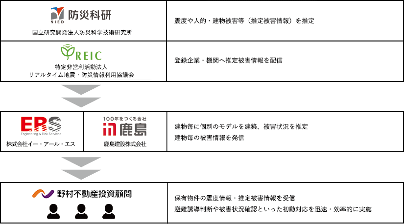 推定震度情報配信システムとは、地震発生後、委託先である株式会社イー・アール・エス及び鹿島建設株式会社が、国立開発研究法人防災科学技術研究所による推定震度情報と、本投資法人が保有する物件の位置(経度緯度)をもとに、物件ごとの推定震度を特定し、資産運用会社の担当者へ震度情報及び推定被害情報が配信されるシステムです。
