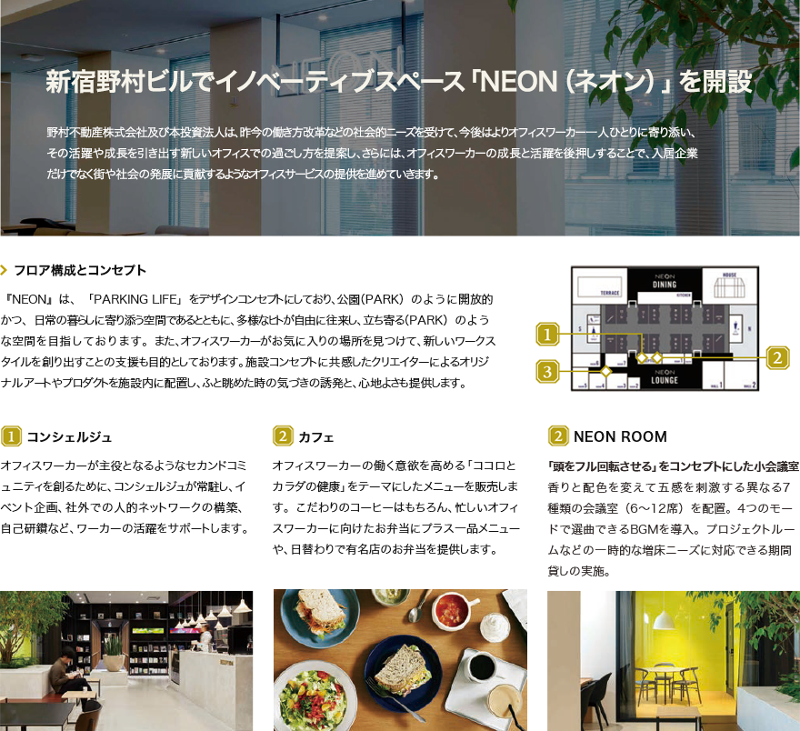 本投資法人はこうした社会的ニーズの変化に対応するため、定期的な顧客満足度調査の実施によるテナントの皆様とのコミュニケーションを通じて、単純なハード面の更新にとどまらないソフト面のサービスを含む新たな機能やサービスを提供することによって、テナントの皆さまのさらなる安心・安全と快適性を追求していきます。 - 新宿野村ビルでイノベーティブスペース「NEON(ネオン)」の提供