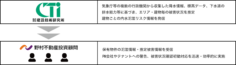 内水氾濫リスクアラートメール配信システムとは、委託先である株式会社建設技術研究所が複数の行政機関から収集した降水情報、標高データや排水能力情報等と、本投資法人が保有する物件の位置(緯度経度)をもとに、物件ごとの内水氾濫を予測し、資産運用会社の担当者にリスク情報が配信されるシステムです。