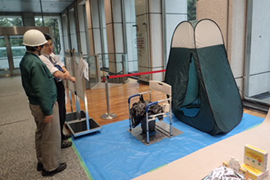 施設内にAED、エレベーターかご内に防災キャビネットの設置、入居者への防災備品の配布等を行い、テナントや来訪者の安心・安全確保に取り組んでいます。 -