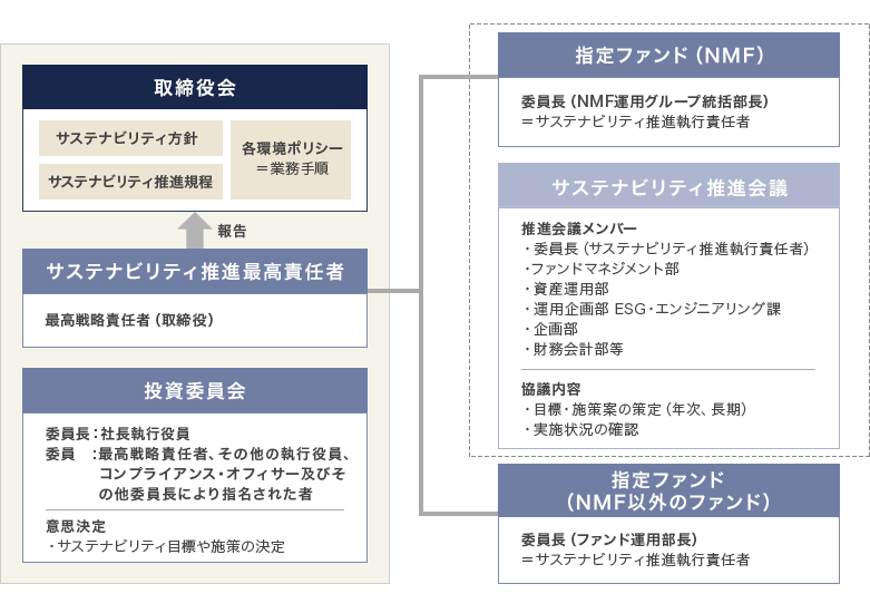 本資産運用会社は、サステナビリティ方針に基づく取組み(気候変動への取組みを含みます。)を継続的かつ組織的に推進するために、以下の体制を整備しています。