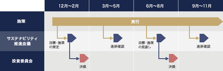 - (4)投資委員会 社長執行役員を委員長とし、最高戦略責任者その他の執行役員等を委員とする本投資法人の運用に係る意思決定機関であり、サステナビリティ推進規程に基づき、年に2回以上、本投資法人のサステナビリティに関する目標や施策等を審議・決定します。