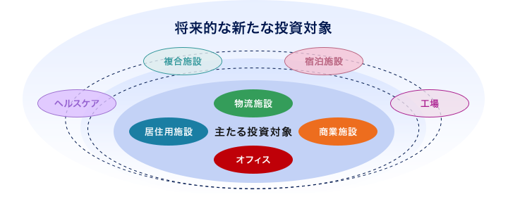 J-REITによる投資対象セクターは、市場創造当初のオフィスを中心とした構成から、商業施設、居住用施設、物流施設、ホテル、工場及びヘルスケア施設にまで多様化が進んでおり、今後更にJ-REIT市場の成長とともにその拡大が期待されています。本投資法人は、この様なJ-REIT市場を取り巻く環境を踏まえ、総合型REITとしての特性を活かした投資対象資産のセクター多様化に対応していきます。そして、より多くの物件情報入手及び投資機会の確保を図ることで、リスク分散の深化と資産規模の拡大を促進し、中長期的な安定収益の確保を目指していきます。